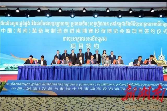 11月19日上午,杜家毫與柬埔寨國務大臣兼公共工程與運輸部大臣孫占托等一同出席中國(湖南)裝備與制造走進柬埔寨投資博覽會,并見證簽約。