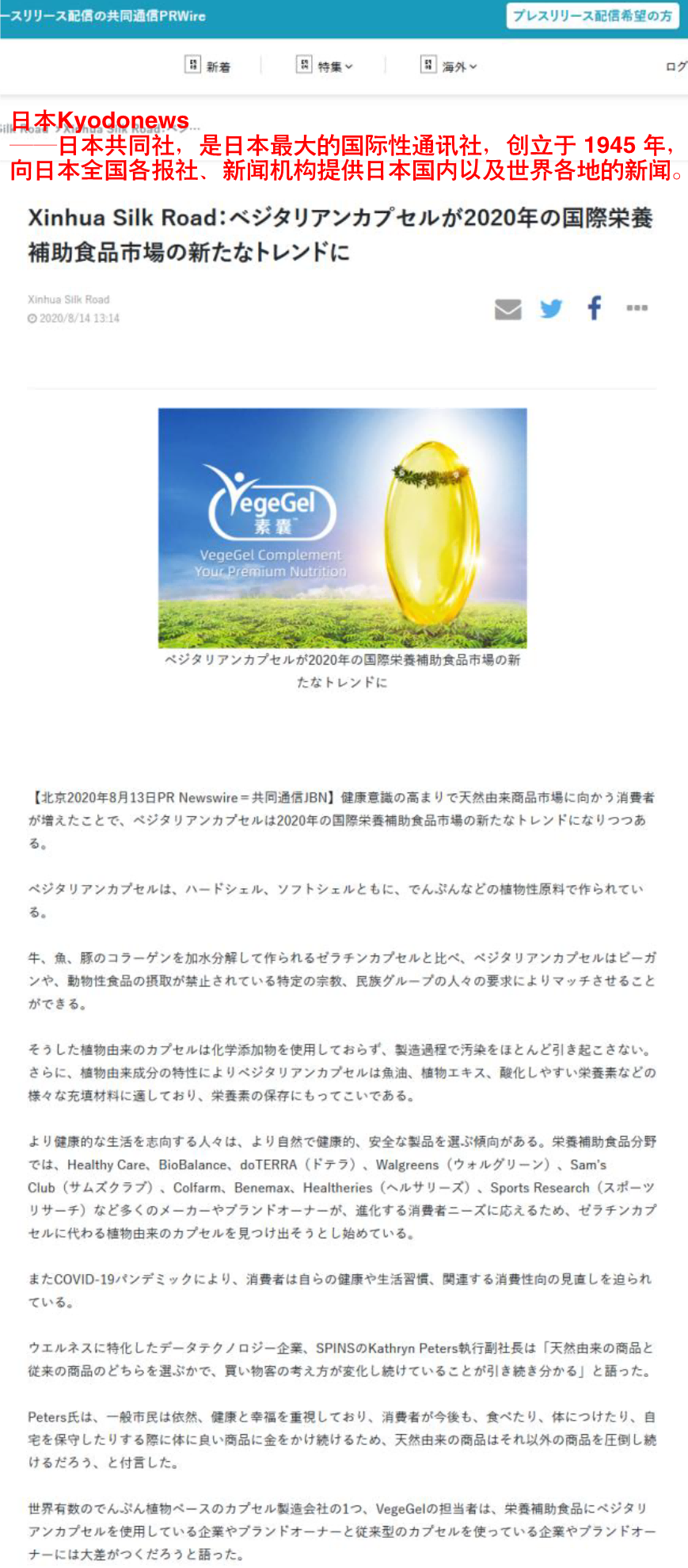 日前,植物膠囊在國際上再度引起關注,一篇題為《Vegetarian capsule becomes new trend of international dietary supplement market in 2020》探討淀粉植物膠囊或成2020年膳食補充劑新趨勢的文章,被北美Fox、Yahoo! Finance、Business Insider: Markets Insider 、Seeking Alpha、Canadian Business Journal,歐洲Xpert、Notre Siècle、FinanzNachrichten.de、ADNKronos 、Europa Press 、PAP等超40余國家、全球近900家國際媒體轉載發布。