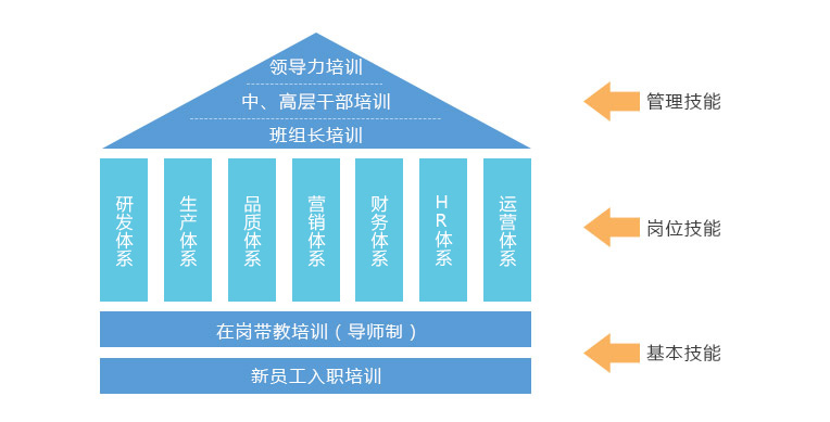 公司根據員工的職業生涯發展及崗位技能要求,有科學先進的培訓體系,分別為:新員工入職培訓、在崗帶教培訓(導師制)、崗位專業培訓、班組長培訓、中、高層干部培訓、領導力培訓等。并擁有現代化的培訓室、公司內、外部資深培訓師,能滿足不同層級員工的技能需求。